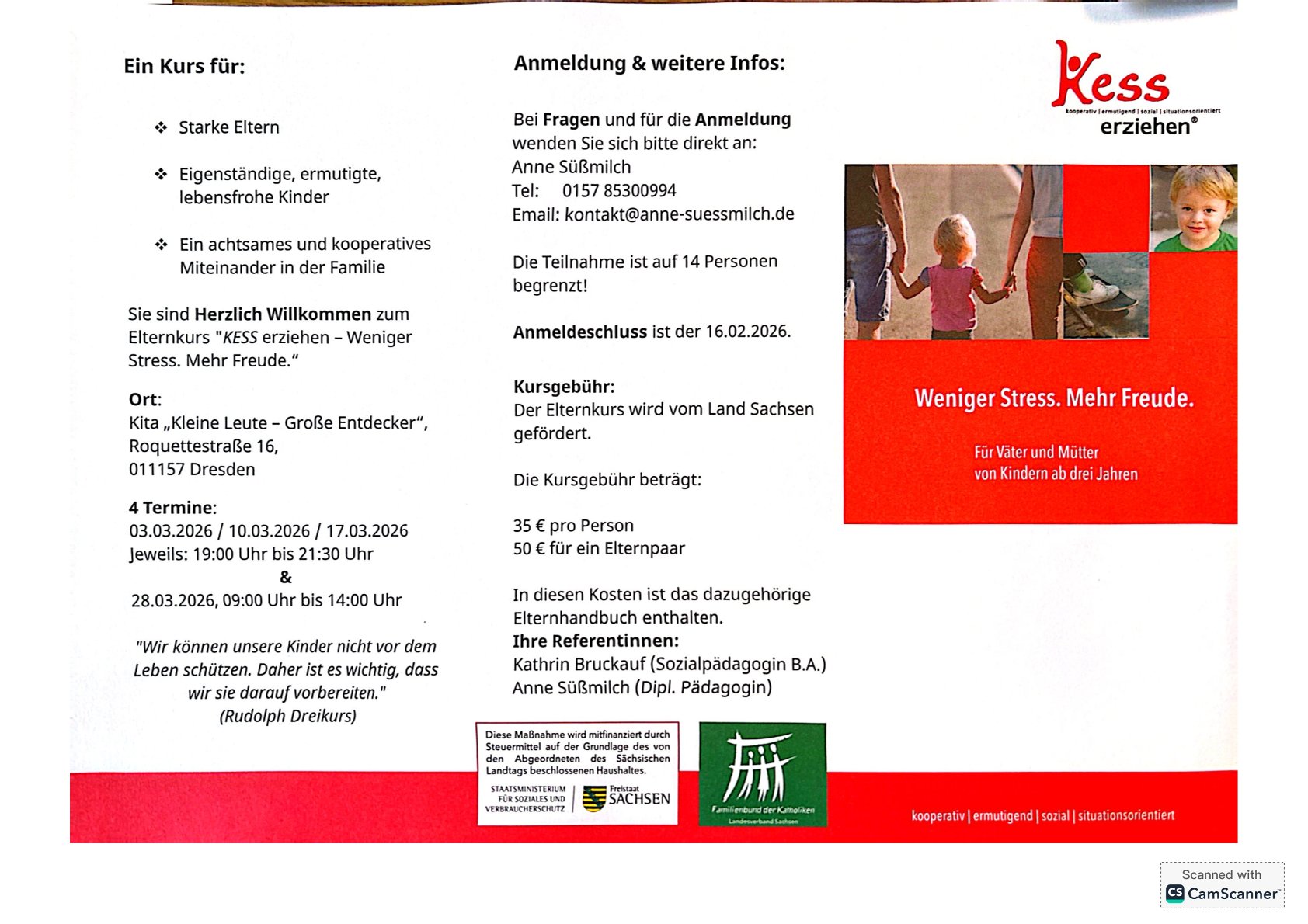 Info: Elternkurs in 5 Einheiten in der Kindertagesstätte „Kleine Leute – Große Entdecker“ Dresden Cotta